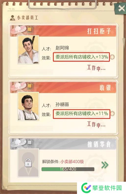 不管是高等级的人才还是低等级的人才,一经委派,则所有店铺收入统一加成。